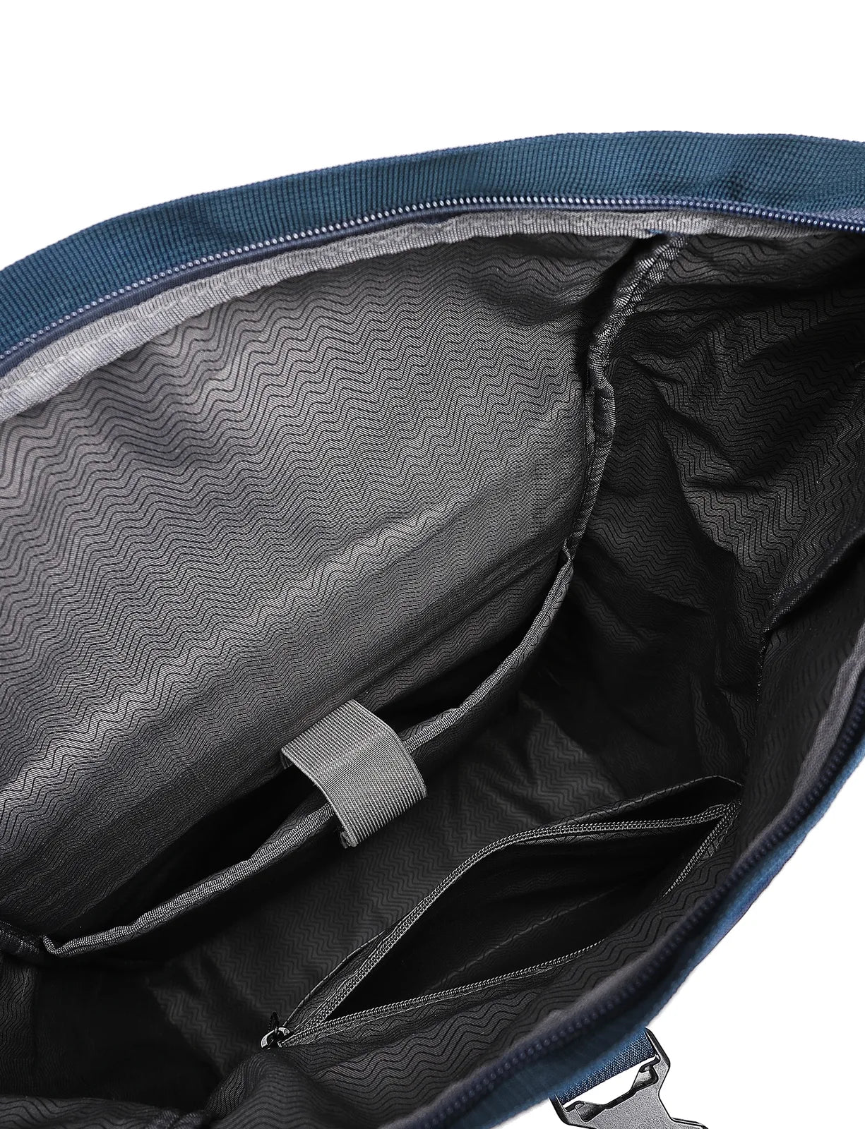 Doppia chiusura della tasca principale: zip e fibbia dopo l’arrotolamento