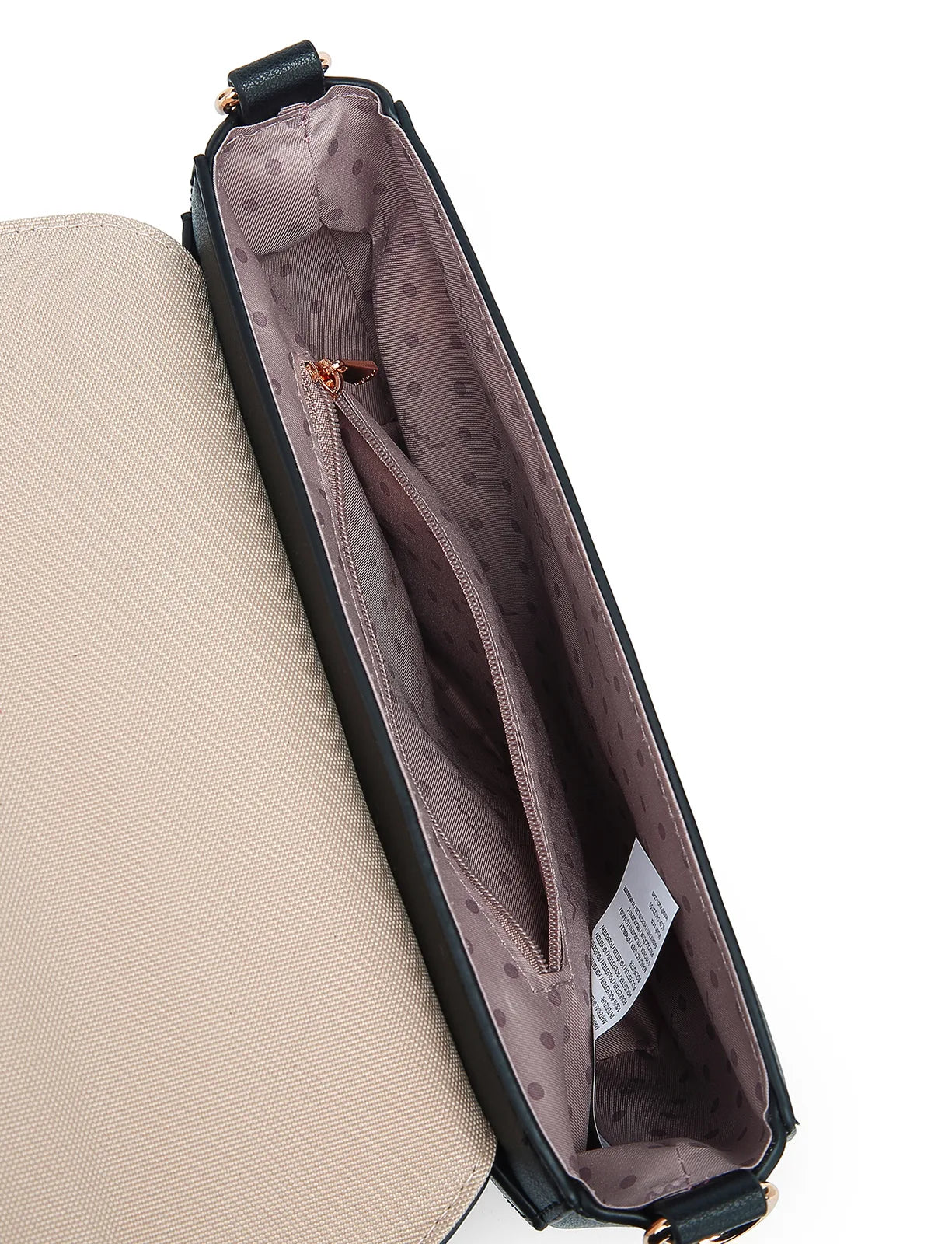 Interno: 1 scomparto principale, 1 tasca interna con zip, 2 taschine aperte