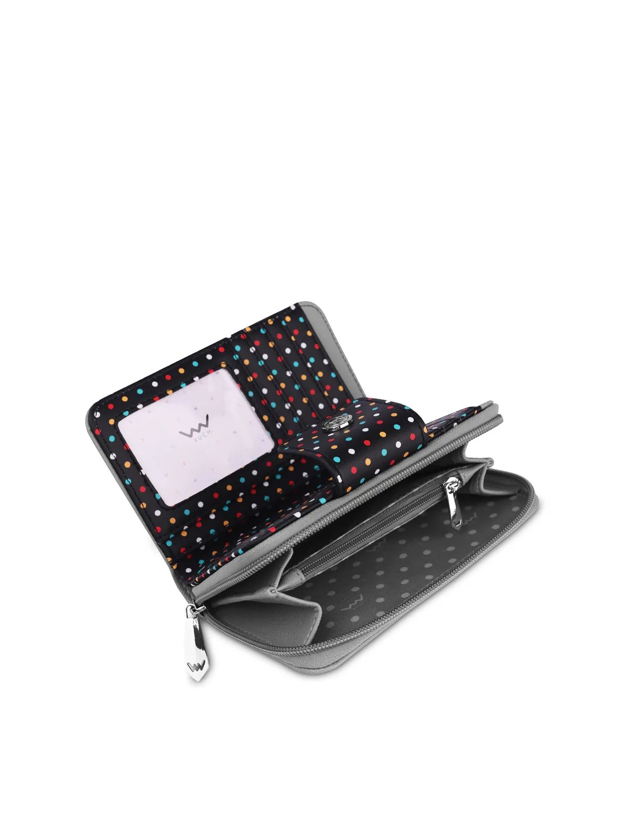 Abbiamo creato per te un portafoglio nero, perfetto fino all’ultimo pois colorato. I tuoi tesori saranno protetti da due zip, così puoi stare tranquilla sapendo che nulla cadrà e tutto resterà al sicuro in questa bellezza. Il tutto dietro una patta ampia che lo rende davvero facile da aprire.
